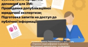 Нагадуємо, що для юридичної допомоги журналістам та редакціям працює «гаряча» телефонна лінія. Щоденно у робочі дні – з понеділка по п’ятницю – з 10-ї до 14-ї години безкоштовні юридичні консультації всім потребуючим надаватиме медіа-юрист Ігор Федоренко. Телефон – 099-986-69-66. «Гаряча лінія» працює в рамках проекту Тернопільського прес-клубу «Сприяння медіа реформам та розвитку …