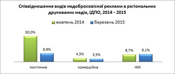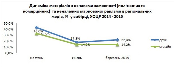 Моніторинг регіональних видань у березні 2015-го показав зростання кількості матеріалів із ознаками замовності та неналежно маркованої реклами у друкованих регіональних медіа (http://osvita.mediasapiens.ua/).