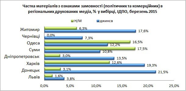 Найбільше публікацій із ознаками замовності розмістили ЗМІ Донецька – 21,5%; Харкова – 19, 3%; Житомира – 17,6%; Дніпропетровська – 13,5%. (Нагадаємо, у виборчому жовтні 2014-го рівень джинси сягав 43%.)