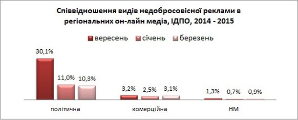 Кількість матеріалів із ознаками політичної та комерційної замовності та немаркованої реклами на сторінках інтернет-ЗМІ у березні не змінилась і становить 14,2%. Найбільше заангажованої інформації розміщують сайти Одеси – 29,6%; Чернівців – 18,5%; Донецька –18,5%; Сум – 15,5%. Причому електронні видання Одеси, Чернівців і Сум дезінформують громадян не гірше, ніж сепаратистські сайти!