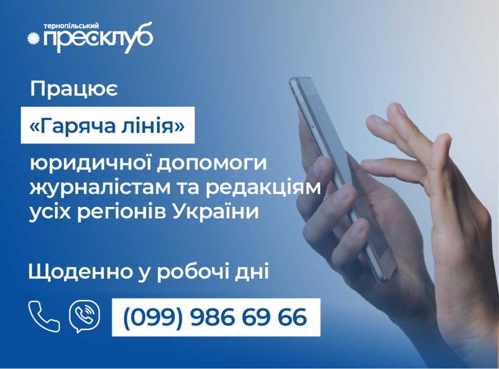 Нагадуємо, що для юридичної допомоги журналістам та редакціям працює «гаряча» телефонна лінія. Щоденно у робочі дні – з понеділка по п’ятницю – безкоштовні юридичні консультації усім потребуючим надаватиме медіаюрист Ігор Федоренко. Телефон – 099-986-69-66.