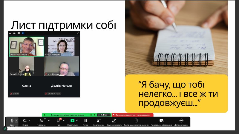 – Коли ми читаємо такий лист нібито не від себе, а наче від близької людини, яка щиро хоче підтримати, він стає для нас нагадуванням: я гідна/гідний підтримки, я маю якісь якості й риси, про які можливо забула або забув, – прокоментував тренер. – А ще варто створити власний словник підбадьорливих фраз.