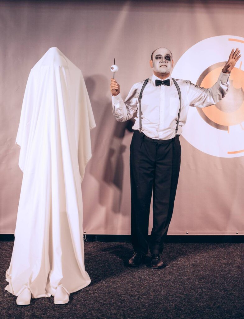 Отже, нас запросили до залу і все почалося. Чому я сказала «все»? Тому що я такого ще не бачила! І все, що відбувалось на сцені, виглядало для мене незвично. Один актор в червоній сорочці, в якого була головна роль саме Еміля Шпорка. Його грав Павло Шардуба, як я дізналася з програмки, що мені вручили на початку спектаклю. Та ще чотири актори, в яких було більше однієї ролі. Кожен з них грав по два, три, чотири різних героя. На обличчях акторів грим, майже як у мімів. Справа в тому, що за сценарієм цього трагіфарсу на одну дію, головний герой Еміль Шпорк не бажає видаляти ліве око, як роблять усі в тій країні, де він живе, щоб боротися з епідемією. Він йде проти системи, де «всі роблять як всі» і намагається пояснити своєму оточенню, що він не несе ніякої небезпеки через те, що ходить з двома очима. Тож, завдяки такому цікавому гриму глядачі бачили, що всі крім Еміля ходять без лівих очей.
