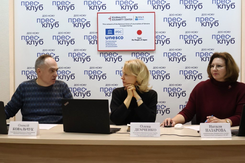 Ці та інші питання обговорювали у Дніпрі під час офлайн-онлайн зустрічі медійників із представницею Національної ради України з питань телебачення і радіомовлення у Дніпропетровській області Оленою Демченко за участі голови Правління ДОО НСЖУ Олексія Ковальчука. Захід відбувся у Дніпровському центрі журналістської солідарності.