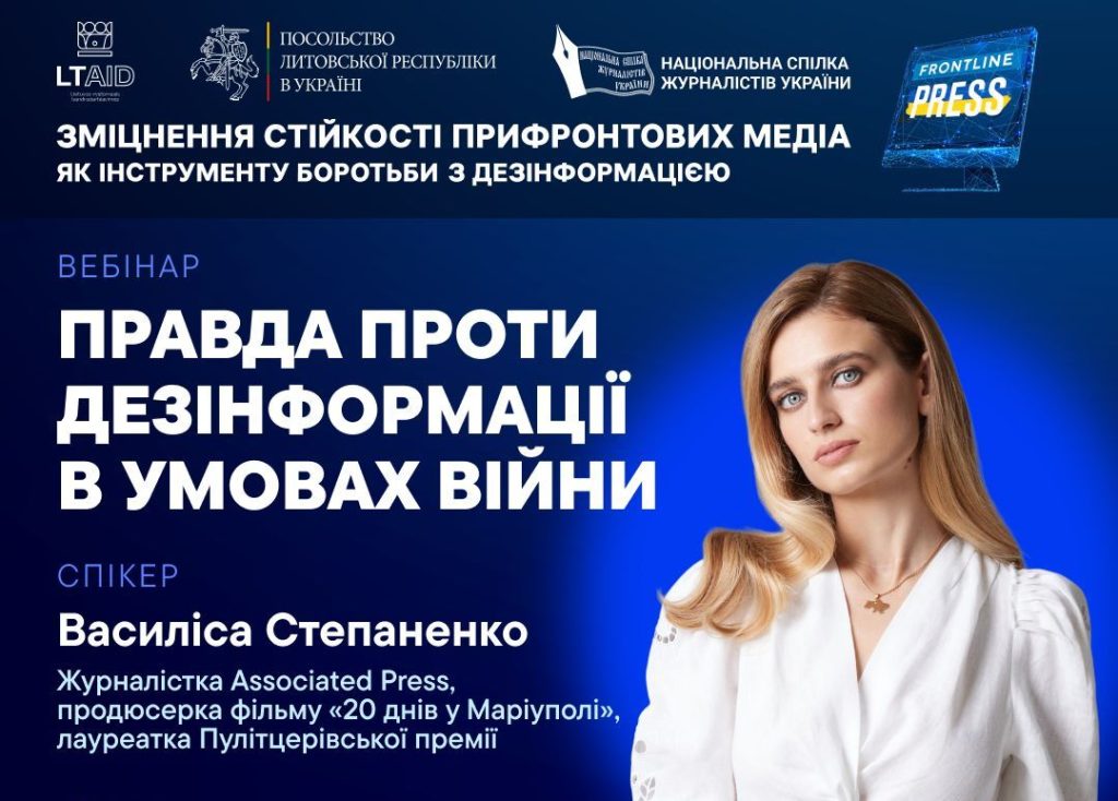 Вебінар організовано в межах проєкту «Зміцнення стійкості прифронтових медіа як інструменту боротьби з дезінформацією». Проєкт фінансується Посольством Литовської Республіки в Україні в рамках Програми Співробітництва з Метою Розвитку та Сприяння Демократії.