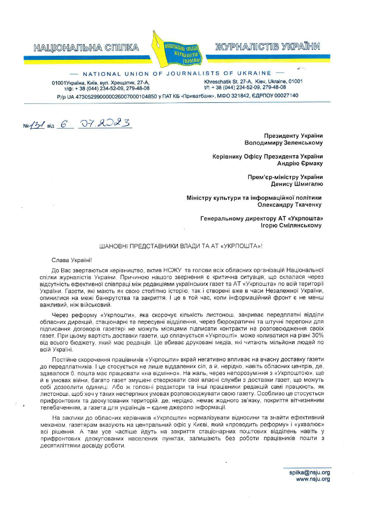 До Вас звертаються керівництво, актив НСЖУ  та голови всіх обласних організацій Національної спілки журналістів України. Причиною нашого звернення є критична ситуація, що склалася через відсутність ефективної співпраці між редакціями українських газет та АТ «Укрпошта» по всій території України. Газети, які мають як свою столітню історію, так і створені вже в часи Незалежної України, опинилися на межі банкрутства та закриття. І це в той час, коли інформаційний фронт є не менш важливий, ніж військовий.