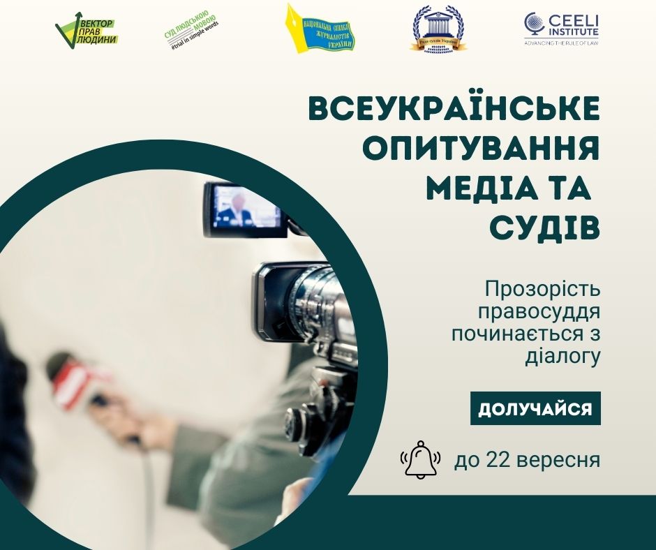 Опитування проводиться в межах проєкту «Діалог між медіа та судовою владою для підвищення прозорості правосуддя», що реалізується у співпраці з Радою суддів України та Національною спілкою журналістів України.