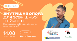 14 серпня 2025 року (четвер) у Дніпровському центрі журналістської солідарності НСЖУ для представників та представниць медійної сфери відбудеться підтримуюча зустріч на тему: «Внутрішня опора для зовнішньої стійкості: як повертати собі спокій і ясність, коли тривожно». Разом із досвідченим психологом, тренером громадської організації «ГОЛОС ПРО» Олександром Макухою розберемо, чому тривога – …