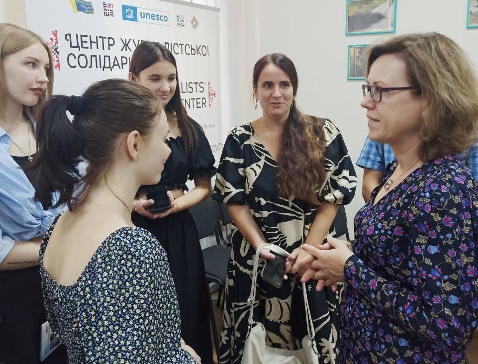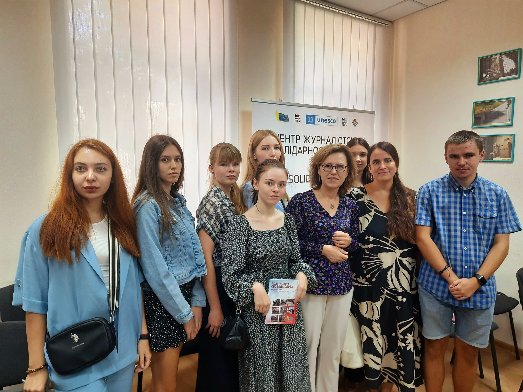 Ліна Кущ та Валентин Хорошун відповіли й на запитання студентів. Зокрема, Валентин Хорошун підкреслив, що не знає іншої професійної спільноти, ніж журналісти, яка би так добре піклувалася про колег, що потрапили в біду через російську агресію, надавала допомогу.
