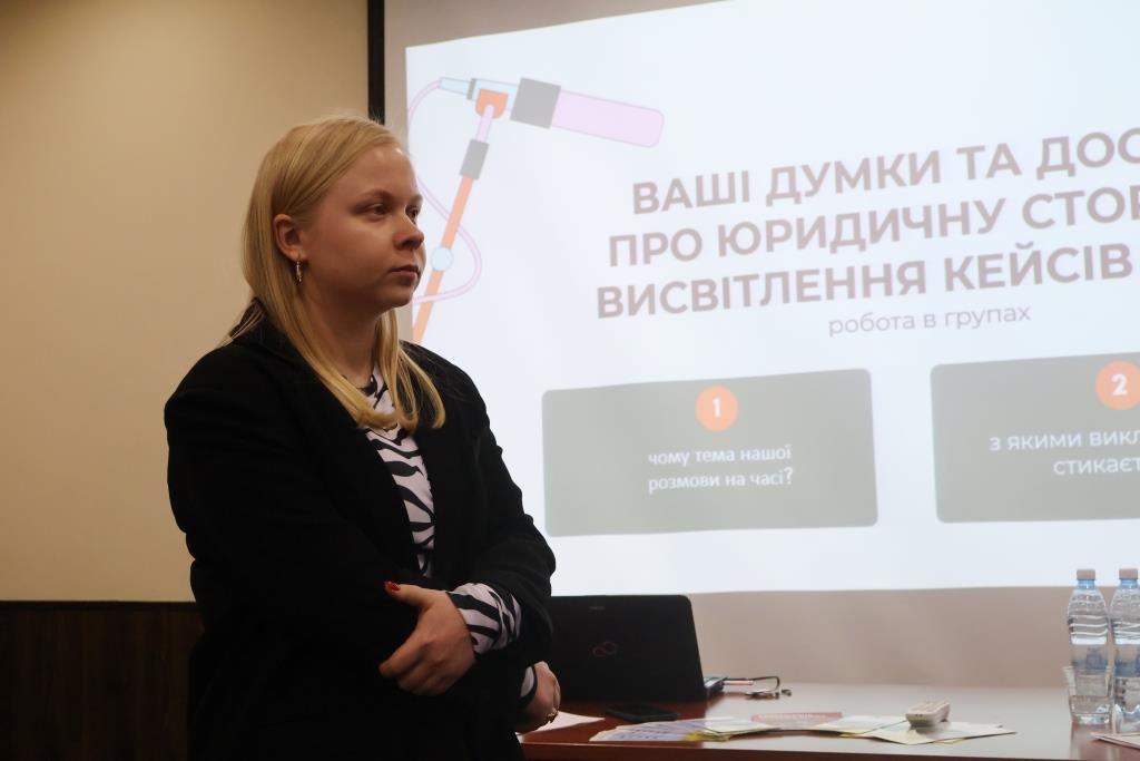 На правових аспектах роботи журналістів, які працюють із тематикою СНПК, детально зупинилась юристка Ірина Моргун. Вона нагадала про юридичні правила висвітлення сексуального насильства та юридичну відповідальність медійників, провела практичний розбір кейсу СНПК, висвітленого у медіа.