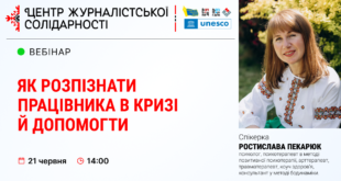 Національна спілка журналістів України запрошує на вебінар «Як розпізнати працівника в кризі й допомогти», який відбудеться 21 червня о 14:00 на платформі ZOOM. Спікерка вебінару: Ростислава Пекарюк – психолог, психотерапевт в методі позитивної психотерапії, арттерапевт, травматерапевт, коуч здоров’я, консультант у методі бодинаміки. Під час вебінару учасники зможуть дізнатися: Як визначити ознаки можливих …