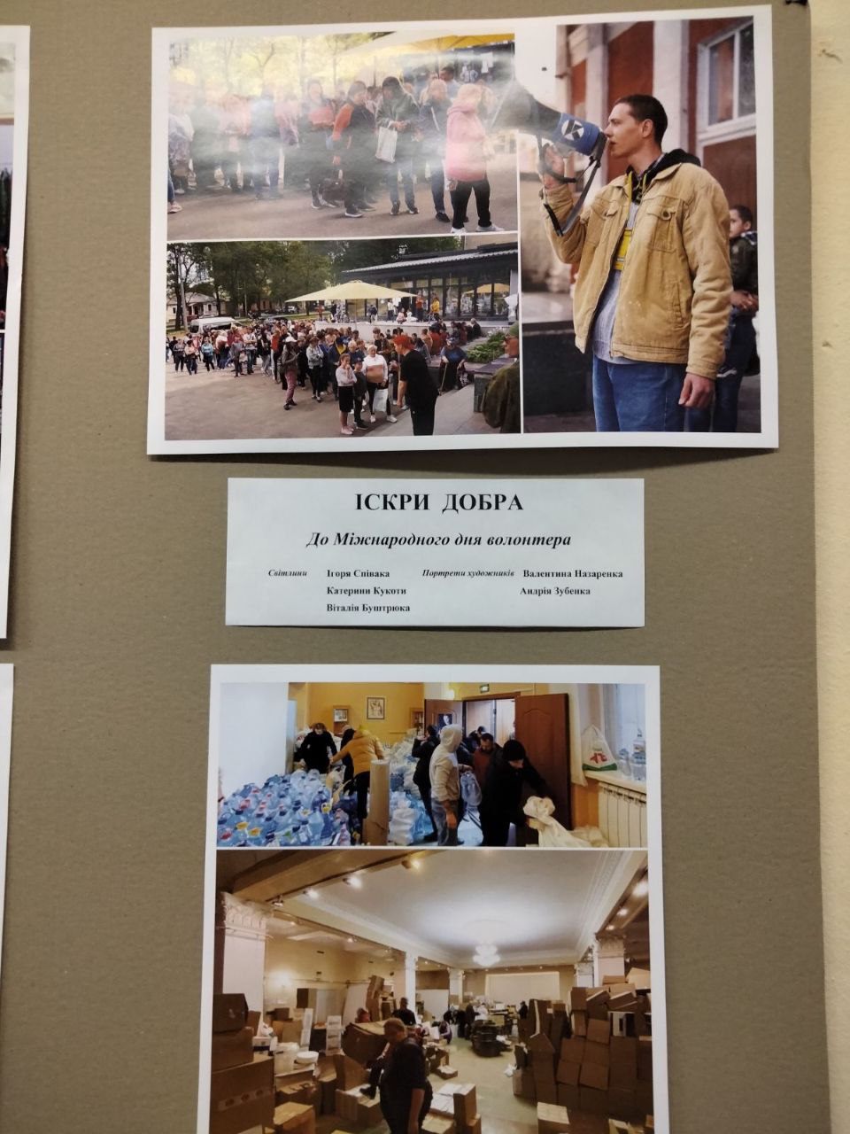 Деякі моменти волонтерського буття, допомоги, а головне – життя попри війну, сфокусовані на виставці «Іскри добра», що відкривається у Будинку мистецтв 5 грудня. Їх автори – медійники Ігор Співак, Катерина Кукота, Віталій Буштрюк, Гліб Добарін, а також художники Валентин Назаренко та Андрій Зубенко, які створили портрети волонтерів у перші дні війни.