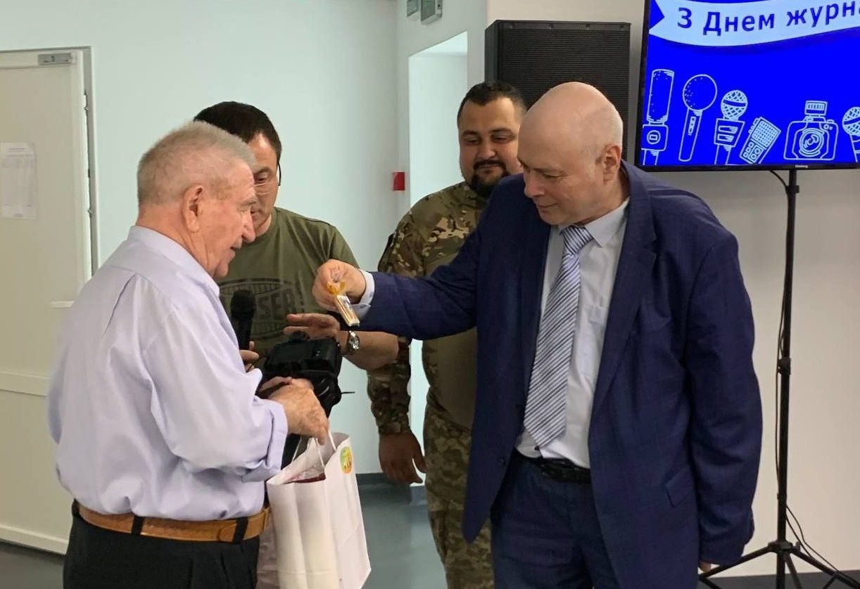 Привітати журналістів також прийшли керівник Кам’янської філії Всесвітньої волонтерської спілки, голова профспілки “Металургів” Олег Нагорний та боєць української армії з позивним Сірий. Вони зауважили, що підтримка журналістів важлива, особливо у воєнний час.