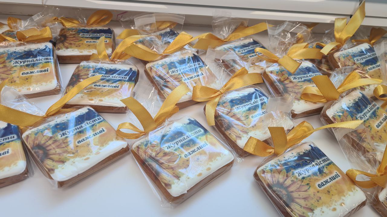 Наприкінці заходу журналісти отримали приємний сюрприз: торт, прикрашений мапою України, та пряники з написом “Журналісти важливі”. Цей символічний жест підкреслював спільну мрію всіх українців – бачити свою країну мирною та квітучою. Торт і пряники стали нагадуванням про важливість журналістської роботи для суспільства, зберігаючи атмосферу єдності та підтримки.