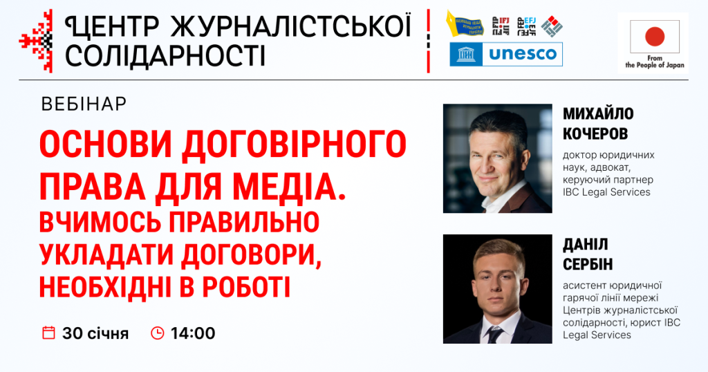 Національна спілка журналістів України та мережа Центрів журналістської солідарності запрошує до участі у вебінарі «Основи договірного права для медіа. Вчимось правильно укладати договори, необхідні в роботі».