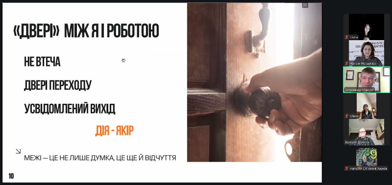 Тож як все ж таки повертатися до свого «Я»? Не менш важливим є вміння завершувати роботу не лише формально, а й психологічно. Для ілюстрації цієї теми учасникам запропонували із заплющеними очима уявити двері, через які вони виходять із робочого простору в своє звичайне, побутове життя, де живе не фахівець, а людина.