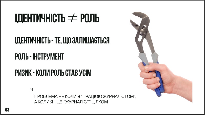 – Хто ці ролі обирає? – запитував психолог. – Оця внутрішня суть людини, яку з точки зору психології можна назвати ідентичністю. Вона завжди одна і та ж, а ролі – це інструмент, який ми обираємо для ефективного функціонування в конкретних обставинах.
