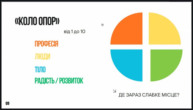 І таку невтішну градацію можна побачити навіть наочно, за допомогою колеса внутрішніх опор. Задля цього варто оцінити за десятибальною шкалою чотири сфери свого життя: професію, людей (стосунки), тіло (здоров’я, фізичний стан) та радість і розвиток.