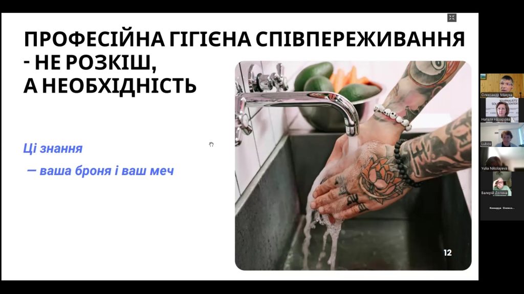 Психологічна стійкість журналіста – це не лише про силу волі й бажання допомогти, а й про здатність дбати про себе та свій внутрішній світ. Саме про те, як не дозволити болю інших його зруйнувати, про «травму свідка», гігієну співпереживання та важливість збереження внутрішніх ресурсів говорили учасники підтримуючої онлайн-зустрічі «Робота з болем інших: як не втратити себе, висвітлюючи травматичні теми».