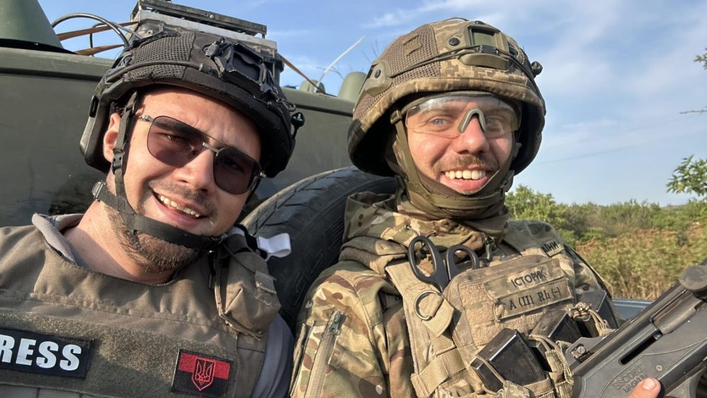 «Кава, бронік, камера, кузов пікапа, швидкість, наземні дрони…» Журналіст Артем Листопад (зліва) каже, що любить свою роботу. Фото: фейсбук / Артем Листопад