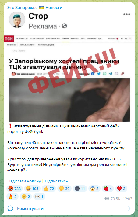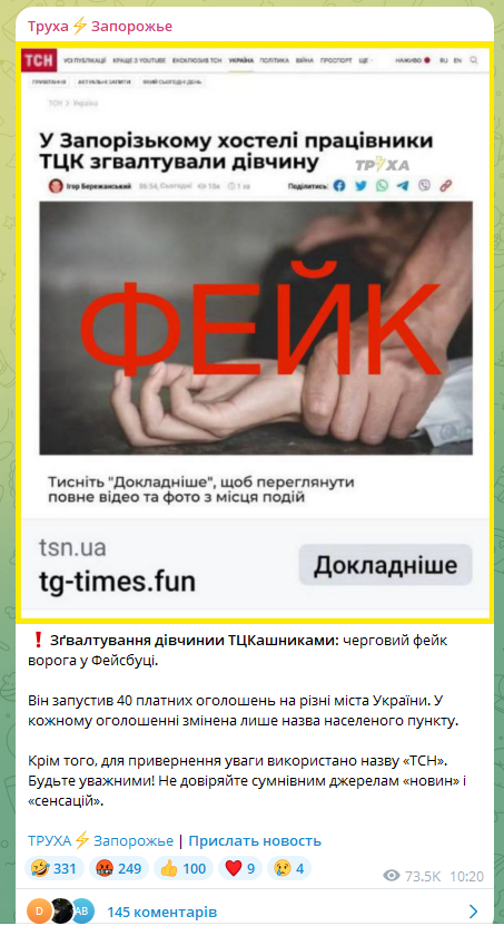 Натомість експерти вказують на позитивну практику викривання ворожих інформаційних впливів. Цього моніторингового тижня «Труха Днепр», «Труха Запорожье», «Это Запорожье |Новости» подавали матеріали з викриттям російських інформаційно-психологічних операцій та зі спростуванням фейків щодо подій, які нібито трапилися у Запоріжжі.