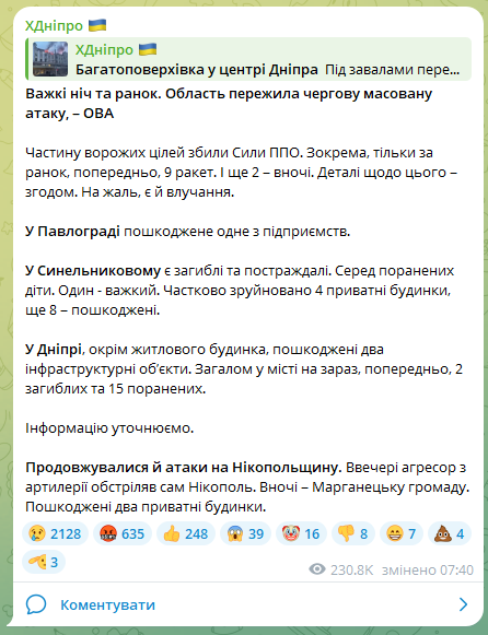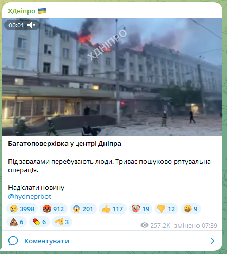 «Дніпро ОПЕРАТИВНИЙ» https://t.me/dneproperatyv (226К; -3К);